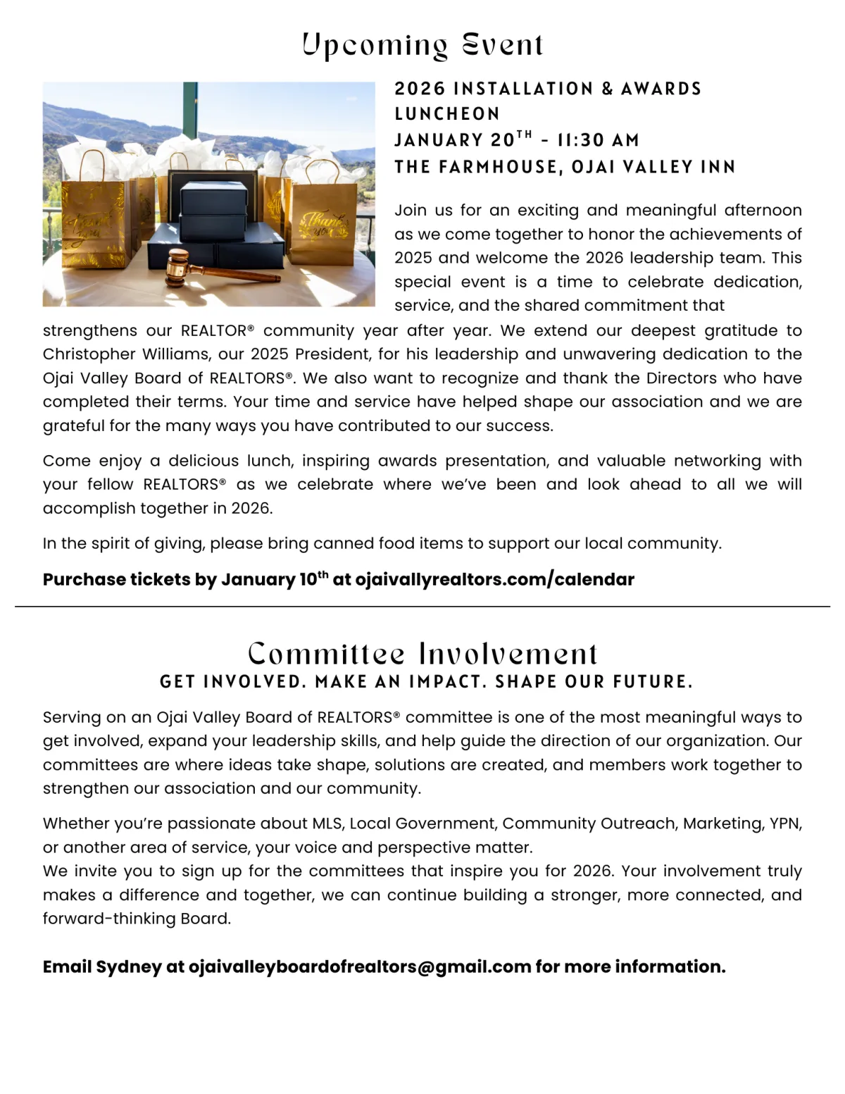 "Thank you for making the installation luncheon so awesome! Such a great venue. The food was fantastic. Beautiful views. Cool music."